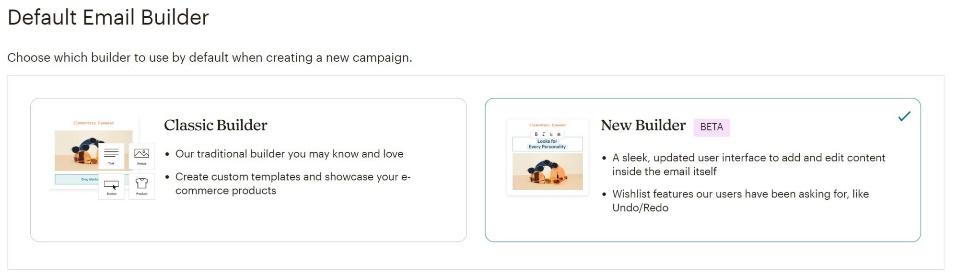 When it comes to campaign management, Mailchimp stands out with its user-friendly editors. It offers two options: The Classic and the New Builder, which you can choose in your profile settings. In this review, we’ll focus on the New Builder, as it comes with enhanced functionality, like the ability to redo or undo your actions.