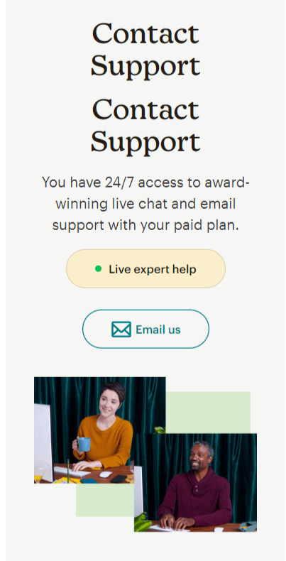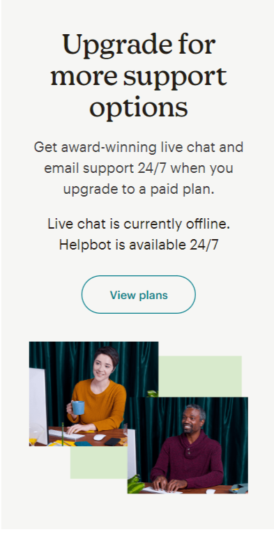 ;Mailchimp’s customer support \is quite helpful, especially with a lot of articles and tutorials available for common issues. If you’re using the free plan, you’ll need to rely on these resources since email support is only there for the first 30 days. Once you upgrade, you get 24/7 email and chat support, and if you’re on the Premium plan, you can even call for help.