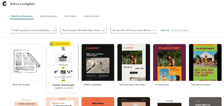 Mailchimp helps you to create text for headlines, paragraphs, subject lines, and more using the Generate tool found in the left-side menu. Just choose your content type, and Mailchimp’s email editor will offer helpful suggestions to save you time.  Mailchimp also provides a solid collection of pre-built templates for emails, which are very easy to customize and use, and also very handy for the new users.