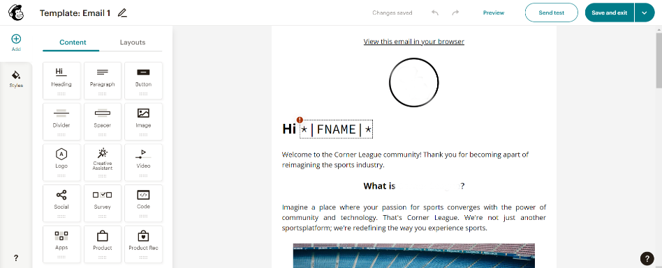 The New Builder features an improved drag-and-drop editor that makes it easy to create email campaigns. You’ll find a variety of content blocks, layouts, and styles to work with, including images, videos, surveys, products, and apps. Adding text is straightforward—just click on the block and use the ribbon at the top to edit. A standout feature is the integrated error-checking tool, which helps you spot potential issues right away. There’s also a beta copy optimization tool to improve your headings and sentence structure. Plus, the Generate tool on the left-side menu allows you to create text for headlines, paragraphs, and subject lines, giving you handy suggestions to save time.