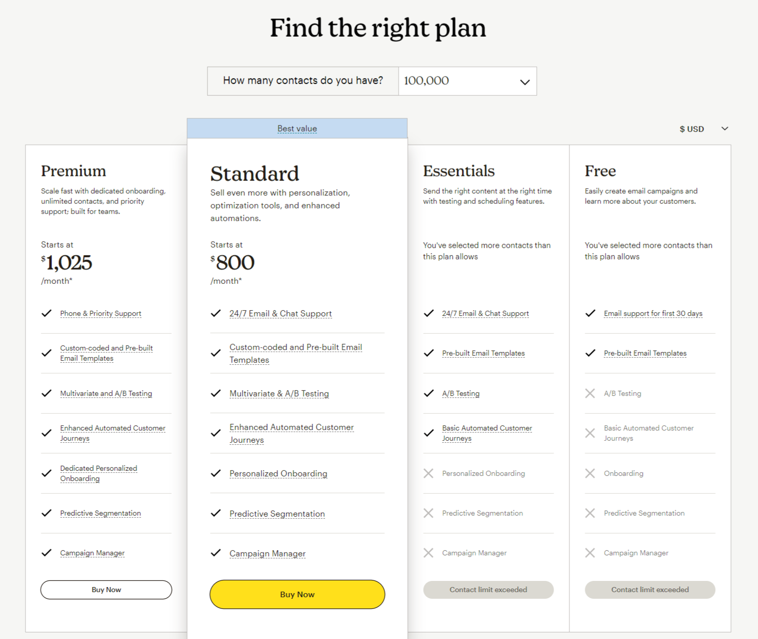 3. Standard Plan: This mid-tier option includes everything from the Essentials plan plus advanced tools like send-time optimization and predictive segmentation. It starts at about $20 per month for 500 contacts, which makes it great for most small to medium-sized businesses.