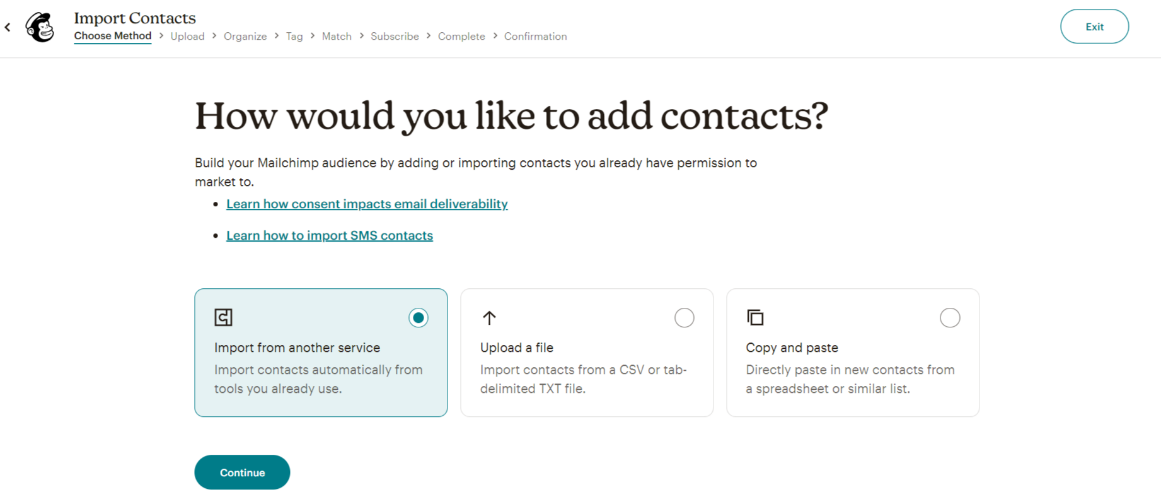 You can add contacts by importing from another service, uploading a file, or simply copying and pasting. You can also add individual contacts easily.